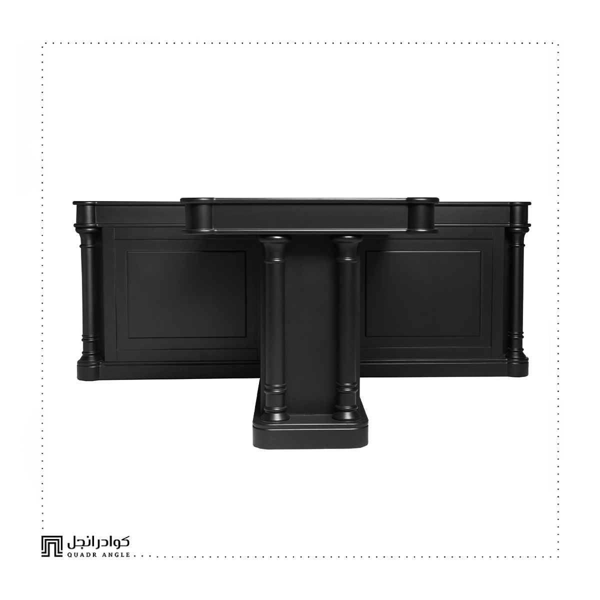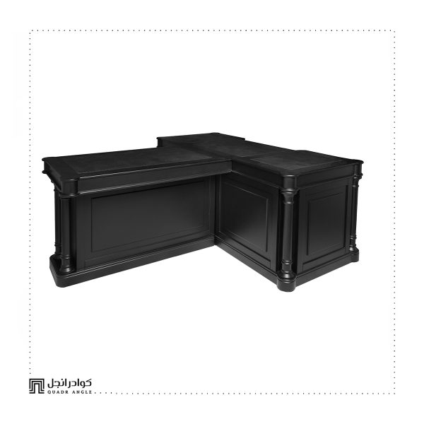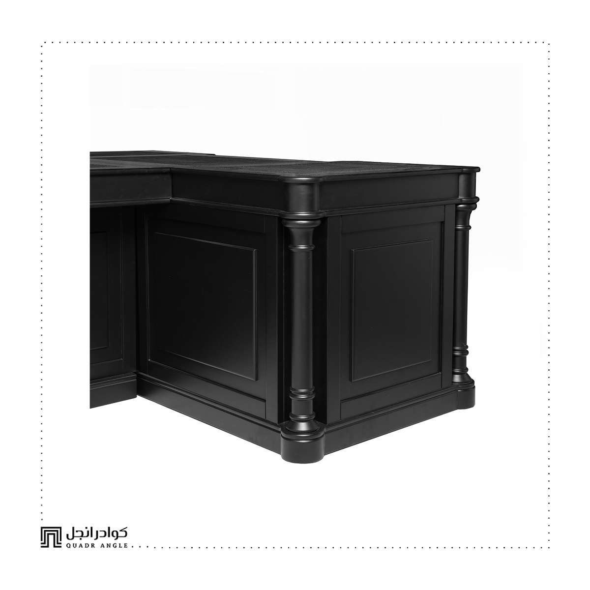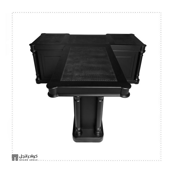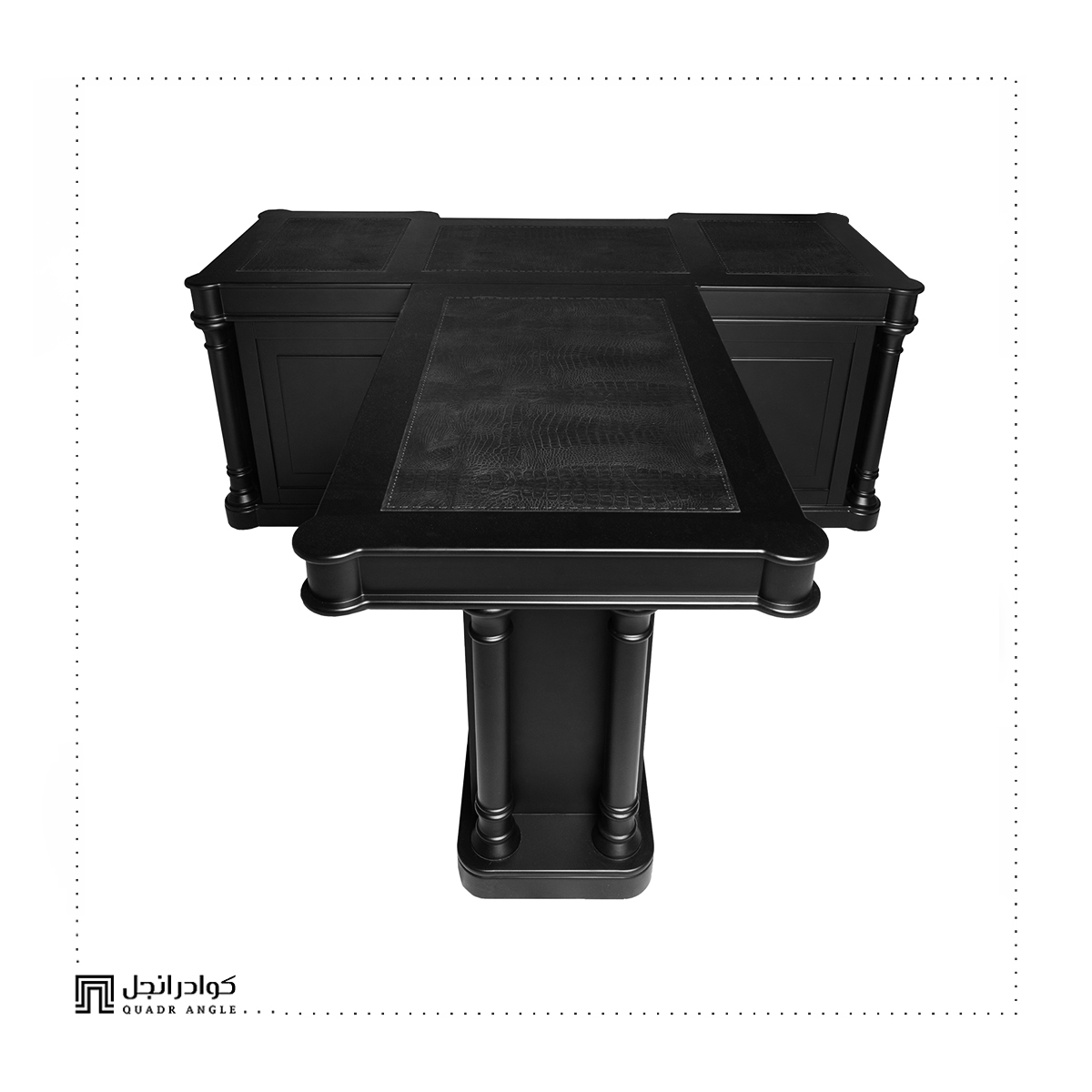 Each surface is adorned with hand-stitched genuine leather panels, perfectly framed by a solid wood structure in a matte black finish. The rounded pillars and detailed molding echo classic architecture, while the layout offers maximum workspace and seamless organization.